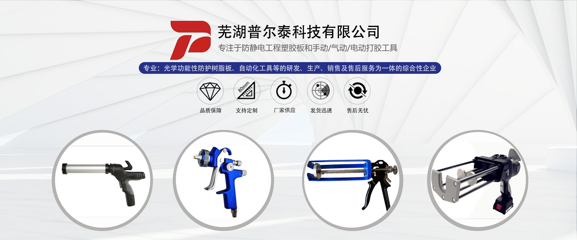 蕪湖普爾泰科技有限公司是深圳迪特邁克實業有限公司的全資子公司,坐落于享有皖江明珠之稱的安徽省蕪湖市,占地面積約1000多平方米,項目前期總投資約1000萬元。公司是一家專業致力于光學功能性防護樹脂板、自動化工具、防靜電PC板、防靜電PVC板、防靜電有機玻璃板、電動膠槍、氣動膠槍、手動膠槍等的研發、生產、銷售及售后服務為一體的綜合性企業,公司擁有一批在該領域有多年經驗的專業人士。 公司產品廣泛應用于國內外電子電氣、通訊制造、液晶顯示、電子裝備、半導體、精密儀器、醫藥、光學制造、車輛制造、新能源及建筑裝飾等行業。其中公司自主研發的“電動膠槍工具”打破國際技術壁壘,結束了此產品依靠進口的歷史。產品經過市場運用,收獲了良好的客戶口碑。公司注重新產品的研發創新,擁有高性能涂料及制品專利二十六余項。代表國內發展前沿水平,主導或參與多項行業標準的建設,立志于做高效性樹脂板材及自動化工具標準的建設者和先行者。